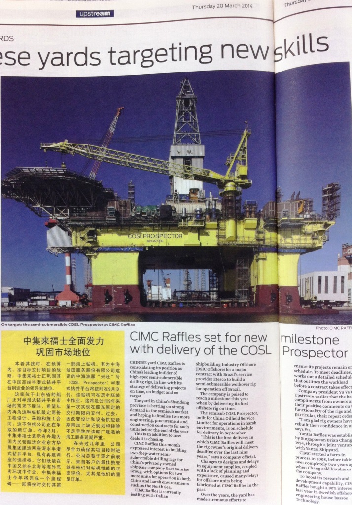 CIPPE 2014展會第二天,海工主流媒體Upstream的CIPPE特刊以“中集來福士全面發(fā)力鞏固市場地位”對中集來福士進行整版報道。