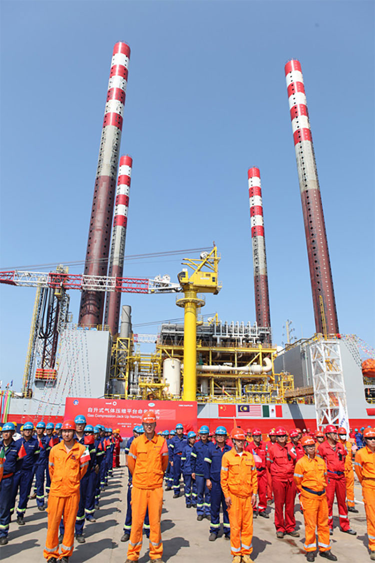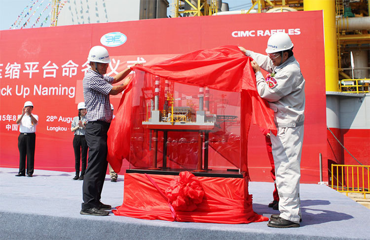 2015年8月28日上午,中集來福士為馬來西亞沿海工程公司(Coastal Contracts)自主設計建造的自升式氣體壓縮平臺AGOSTO-12在龍口基地命名,近日將開赴墨西哥海域作業。