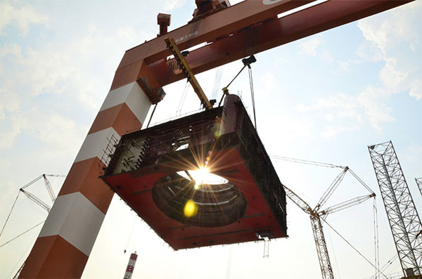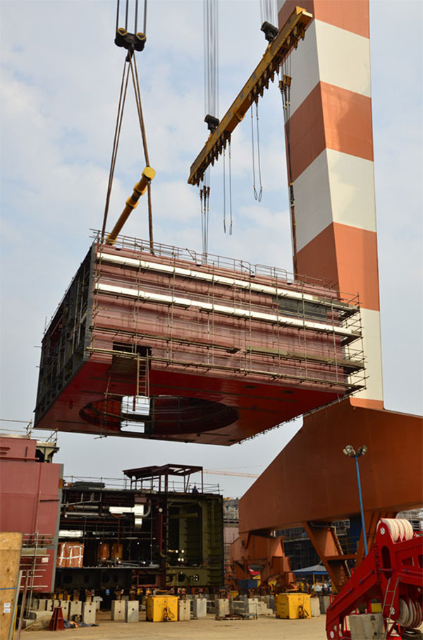 2015年8月29日下午,中集來福士建造的第10座Super M2自升式鉆井平臺主船體分段在龍口基地合攏完成。項目自2015年6月12日開始鋪設龍骨,僅用2.5個月就完成了全部主船體分段的合攏,在此期間,克服了10個雨天,等待設備12天等不利因素。同時,平臺的預舾裝率也大幅提高,目前管、機、電、通風以及鐵舾專業舾裝均高達96%以上。在充分總結同系列平臺設計建造經驗的基礎上,此項目成功進行了圍井分段模塊化建造、無余量合攏等新工藝。