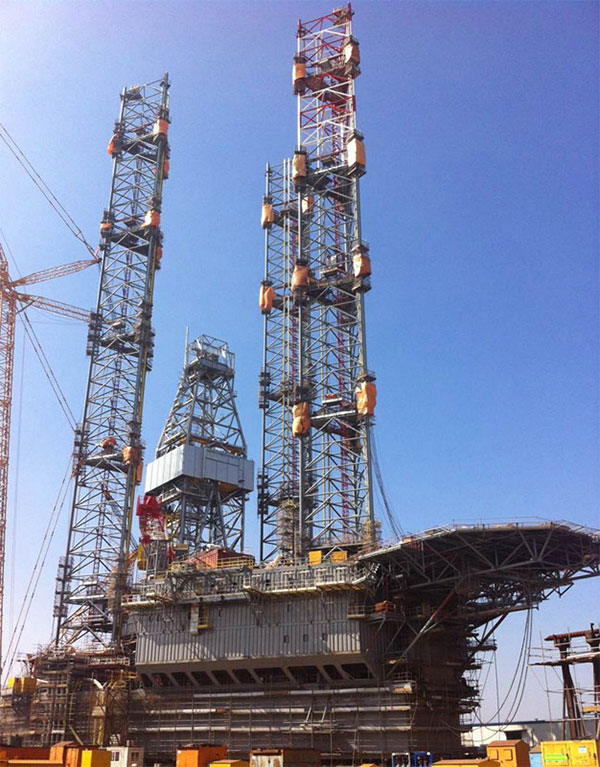 2015年9月18日下午17時37分,隨著1250T履帶吊的落鉤,中集來福士第9座Super M2自升式鉆井平臺樁腿合攏工作在龍口基地全部結束,這次創造性地在船臺上完成全部樁腿的合攏。