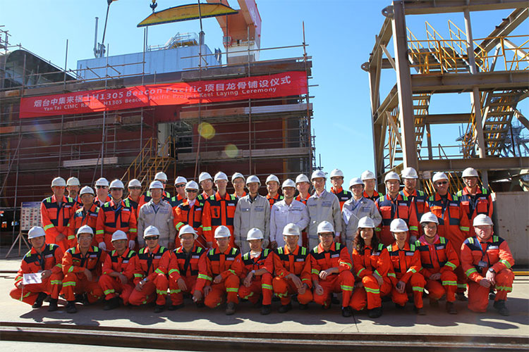 2015年10月12日下午13:30,中集來福士設計建造的第三座GM4-D 半潛式鉆井平臺Beacon Pacific龍骨鋪設儀式在煙臺基地舉行,客戶、DNV GL船級社、項目組成員等50余人出席儀式,共同見證了龍骨鋪設節點的達成。至此, Beacon Pacific項目全面進入分段合攏階段。截至目前,該平臺全部108個分段中已有37個分段完成終檢、17個分段完成涂裝,總進度37.27%,領先計劃進度3.22%。整個項目正順利推進中。
