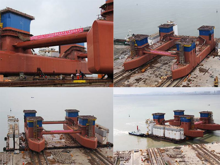 2016年9月14日早上6時40分,由中集來福士自主研發設計建造的半潛式生活平臺CR600上船體在海陽基地開始下水滑移,12時08分成功滑移到“德浮”2號駁船。歷時5小時,CR600項目上船體順利下水。