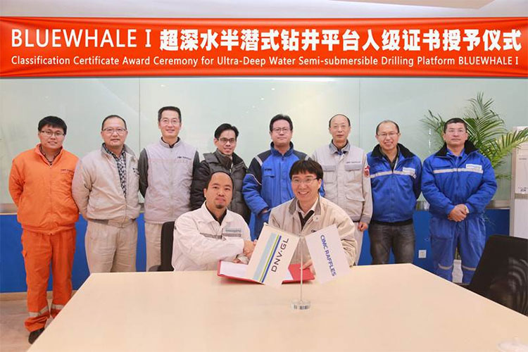 2016年12月28日,中集藍鯨1號(BLUEWHALE I)順利取得DNV GL船級社入籍證書。船級社-DNV GL、船東、中集來福士三方代表共同出席證書授予儀式,并簽署、頒發船舶入級證書。
