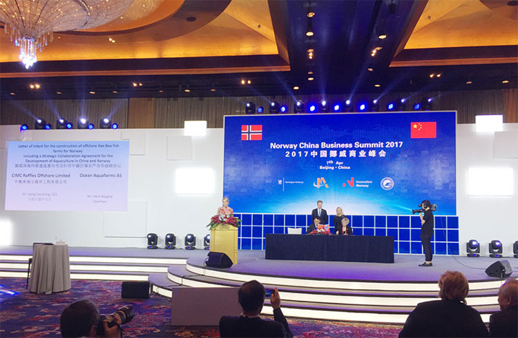 峰會上,中集來福士總裁王建中與挪威Ocean Aquafarms AS公司董事長Heidi Baugstø簽署了《挪威深海網箱建造意向書及針對中挪區域水產合作戰略協議》,涉及5座Hex Box養殖網箱建造,潛在價值高達2.5億美元。挪威首相索爾貝格及全國政協副主席王欽敏共同見證了協議簽署過程。