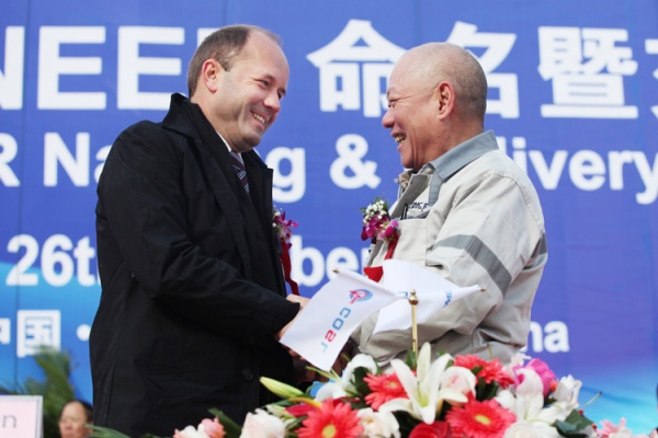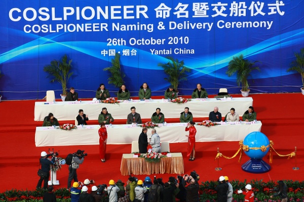 10月26日上午,中國首座深水半潛式鉆井平臺(tái)COSLPIONEER在煙臺(tái)舉行交船儀式。國家工信部裝備司副司長李東、國家能源局能源節(jié)約和科技裝備司副司長黃鸝、山東省國防科工辦主任王超英、煙臺(tái)市市長張江汀、煙臺(tái)市副市長王國群,中國海洋石油總公司副總經(jīng)理兼中海油田服務(wù)股份有限公司(以下簡稱“中海油服”)董事長劉健,中海油服首席執(zhí)行官兼總裁李勇,招商局集團(tuán)總裁兼中集集團(tuán)董事長李建紅、中集集團(tuán)總裁兼中集來福士海洋工程(新加坡)有限公司董事長麥伯良、中集集團(tuán)副總裁兼煙臺(tái)中集來福士海洋工程有限公司董事長于亞、煙臺(tái)中集來福士海洋工程有限公司首席執(zhí)行官章立人,挪威王國駐華大使斯文、挪威船級(jí)社總裁Tor E. Svensen等出席了COSLPIONEER的交船儀式。