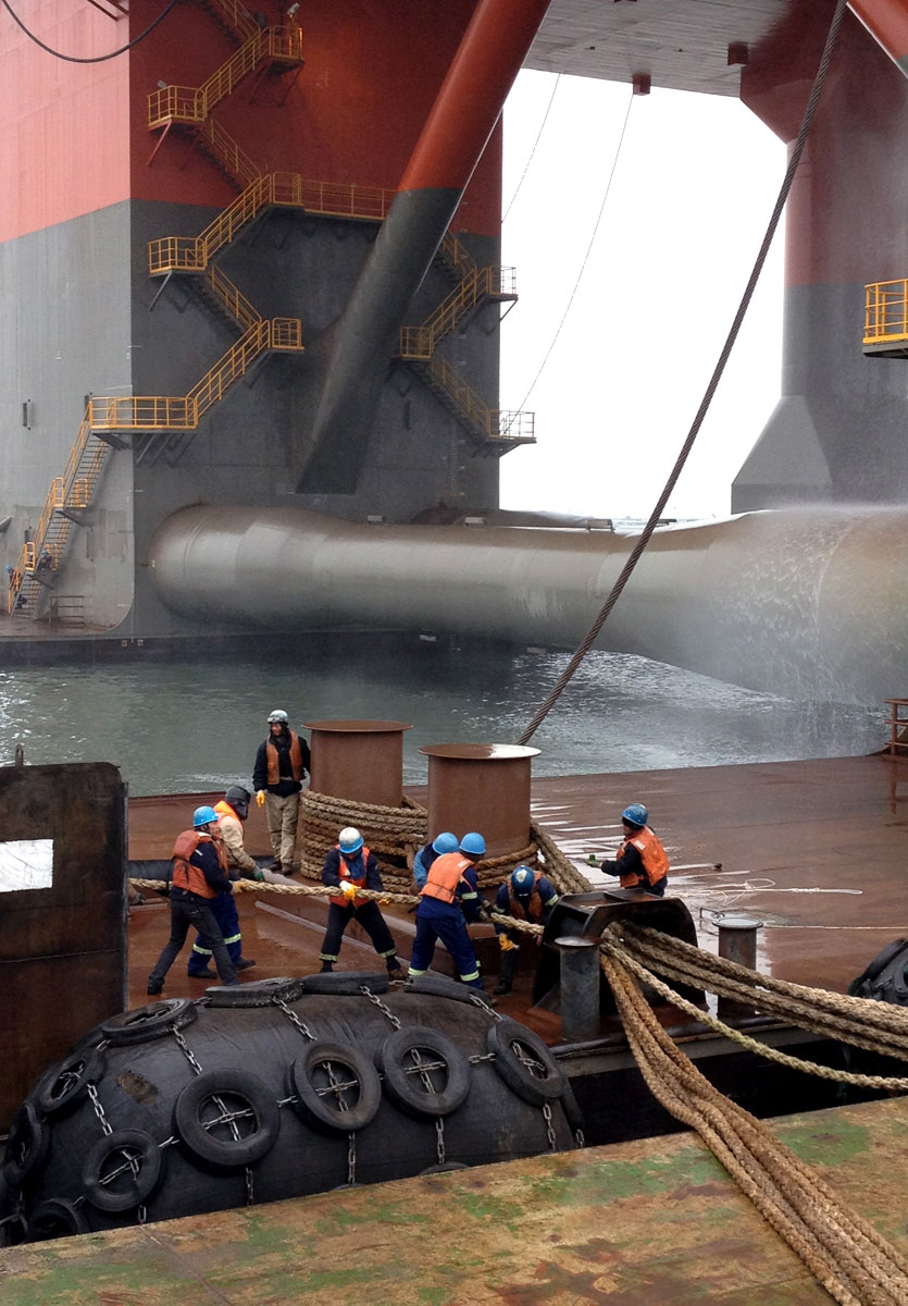 3月19號(hào)上午9點(diǎn),由中集來(lái)福士自主研發(fā)設(shè)計(jì)、建造的深水半潛式起重生活平臺(tái)SSCV 206完成試航各項(xiàng)任務(wù),在一條主拖輪和四條輔拖輪協(xié)助下,平穩(wěn)地??吭谥屑瘉?lái)福士深水碼頭。此次試航從3月14日14點(diǎn)始,總共歷時(shí)4天18個(gè)小時(shí),較原定計(jì)劃提前了3天6個(gè)小時(shí)。試航期間,試航小組所有工作人員共同協(xié)作與努力,按照計(jì)劃滿足了ABS CIRCLEP的所有要求,先后進(jìn)行了拋錨試驗(yàn)、下潛試驗(yàn)、震動(dòng)噪音測(cè)試、壓載速度測(cè)試、諧波測(cè)試、磁羅經(jīng)測(cè)試等工作。SSCV 206自3月15日早8點(diǎn)成功拋出第一個(gè)錨后,全程共拋出12個(gè)錨。本次成功試航為后續(xù)的各項(xiàng)工作奠定了基礎(chǔ)。