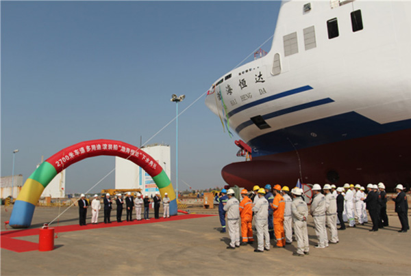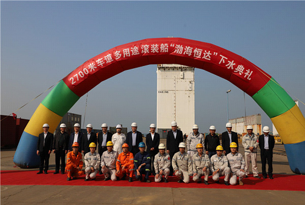 “渤海恒達(dá)”輪是中集來福士繼9月份交付了第一艘姊妹船“渤海恒通”輪后迎來的第二艘滾裝船下水,其總長189.9米,型寬26.4米,上甲板高度15.4米,擁有3米寬度的車道約2700米, 3層車輛艙,設(shè)計(jì)吃水6米,續(xù)航力最大約5000海里,服務(wù)航速可達(dá)到17節(jié)(約31.5公里/時(shí)),是目前亞洲最大的多用途滾裝船。該船為雙機(jī)、雙槳、尾機(jī)型的大型滾裝運(yùn)輸船舶,其推進(jìn)裝置采用2臺(tái)船用中速柴油機(jī),分別通過減速齒輪箱及傳動(dòng)軸系驅(qū)動(dòng)可變螺距螺旋槳,是承載各類貨車、轎車及集裝箱的現(xiàn)代化節(jié)能環(huán)保型多用途滾裝船。該輪配備艏側(cè)推、減搖鰭和防橫傾裝置,三層甲板為全通甲板,艏艉上下車,配備艏跳板、艉直跳板、艉斜跳板、斜坡道和升降平臺(tái);機(jī)艙設(shè)備采用國際品牌,配備2臺(tái)MAN主機(jī),單臺(tái)最大功率4500kw。船舶配備先進(jìn)的通導(dǎo)設(shè)備和動(dòng)力設(shè)施;減搖鰭和減搖水艙提高了船舶抗風(fēng)等級、船舶安全性和舒適性。船舶還專門配備了船員健身房,讓船員在工作之余,有更多休閑娛樂空間。該船將交付給由渤海輪渡與恒通物流股份有限公司、龍口港集團(tuán)有限公司成立的渤海恒通輪渡有限公司,用于運(yùn)營渤海灣及國內(nèi)沿海滾裝運(yùn)輸業(yè)務(wù)。